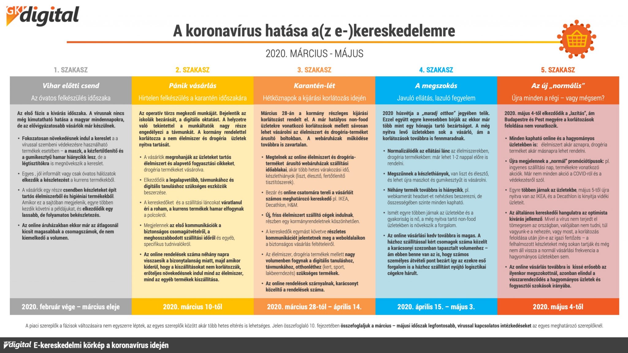2020. március közepén a koronavírus egyik napról a másikra átrajzolta Európa és Magyarország hétköznapjait. Az emberek nagy részét teljesen felkészületlenül érte, amikor a járvány hazai megjelenésével szinte egyidejűleg a kormány meghirdette a #maradjotthon# kampányt, ezért mindenki elkezdte a legszükségesebb élelmiszerek, tisztítószerek, távmunkához és otthon tanuláshoz szükséges eszközök pánikszerű beszerzését. Miközben a gazdaság szinte teljesen leállt, a koronavírus miatt kialakult helyzet sebességváltásra késztette az online kereskedelmet. Az új vásárlók megjelenése és a karácsonyi szezont idéző csomagszámok vajon meddig tartják lendületben az e-kereskedelmi piacot és hogyan reagáltak a helyzetre a kereskedők?