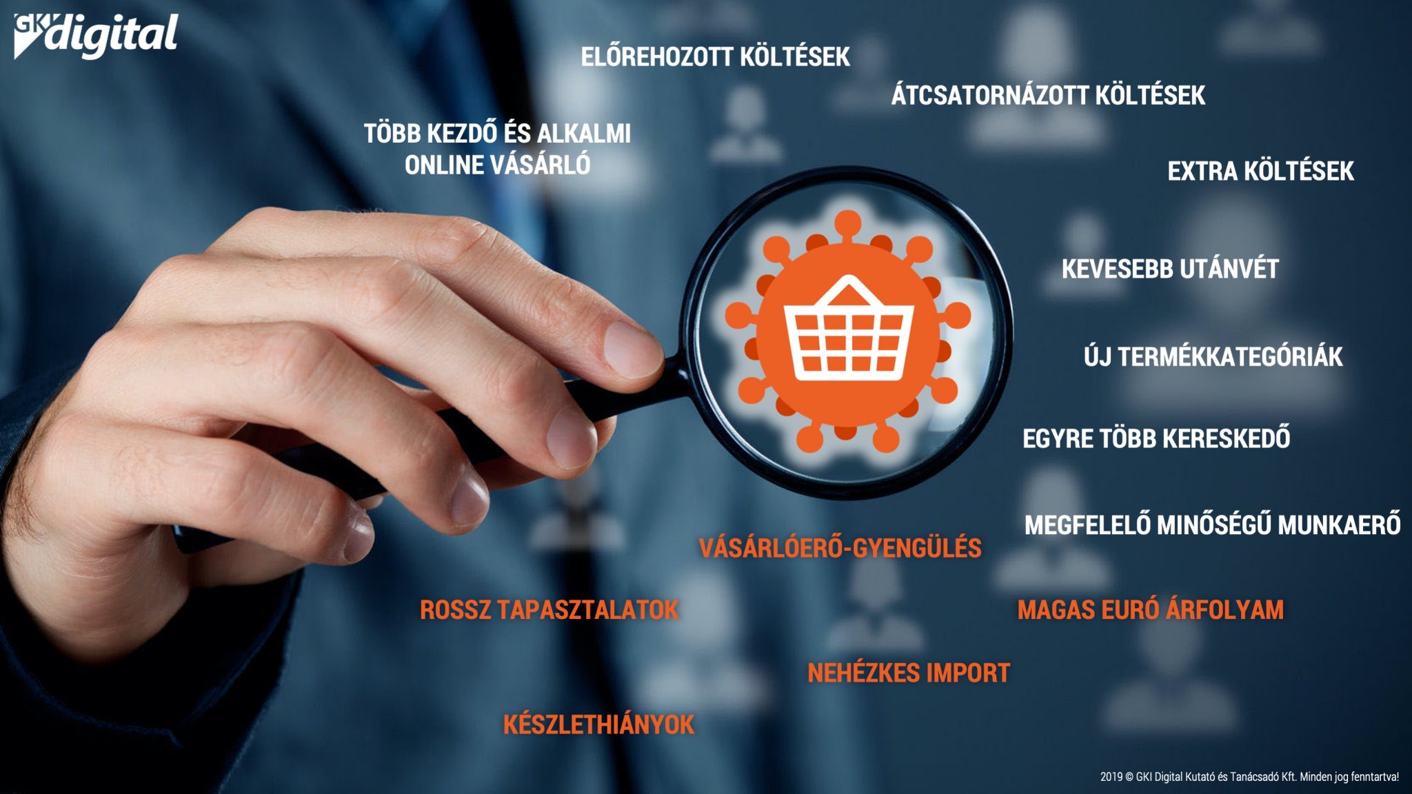 A GKI Digital mérései szerint a járvány eredményeképp március közepe és április vége közötti másfél hónap során – csupán a termékrendelések tekintetében – több mint 50 ezer új vásárló jelent meg a magyar online kiskereskedelmi piacon, ezzel az aktív online vásárló, felnőtt lakosság száma már eléri a 3,35 millió főt. A bővülés mértékét érzékelteti, hogy 2019-ben 8 hónap alatt nőtt organikusan ilyen mértékben az új belépők száma, mint most a járvány hatására alig másfél hónap alatt.