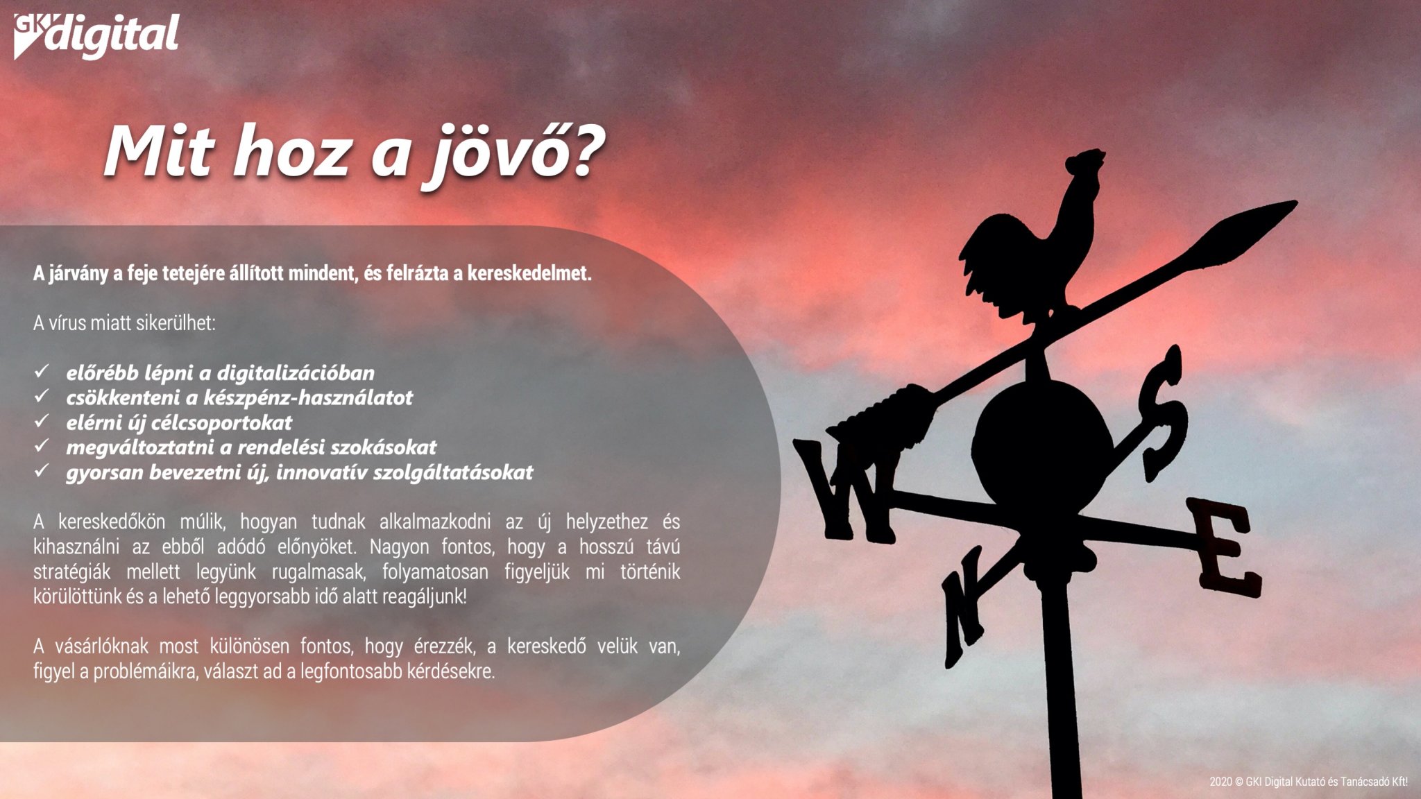 Ez az időszak hatalmas lehetőség az új szereplőknek a piacra lépésre, illetve a hosszabb ideje jelen levők számára új vásárlók elérésére. A képet azonban árnyalja, hogy sokan a vásárlók közt kényszer miatt próbálják ki az online szolgáltatásokat és mindezt épp egy olyan időszakban teszik, amikor a szolgáltatási színvonal messze elmarad a szokásostól. Éppen ezért ez nem ideális időszak a belépéshez és fontos, hogy ezt a vásárló is tudja, értse. Az 5-10-15 napos átfutási idő nem tekinthető elfogadottnak, normálisnak, azonban a járvány-helyzet alatt még gyakran ez is elfogadható alternatívát jelenthet. Mivel az üzletben vásárlás nem csak szükséglet, hanem egyfajta szociális időtöltés is, a vírus lecsengésével nagyon sokan újra vissza fognak térni a bolti vásárláshoz. Azonban, ha a vásárlónak pozitív élményei maradnak az internetes rendelésről, nagyobb eséllyel használja majd alkalmanként vagy akár rendszeresen is az online áruházakat bevásárlás céljából. Azok a kereskedők, akik ebben a helyzetben nem okoznak csalódást, számíthatnak arra, hogy a vásárlók nagyobb arányban használják majd a jövőben is a szolgáltatásukat.